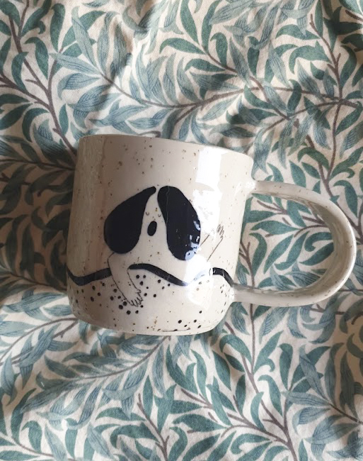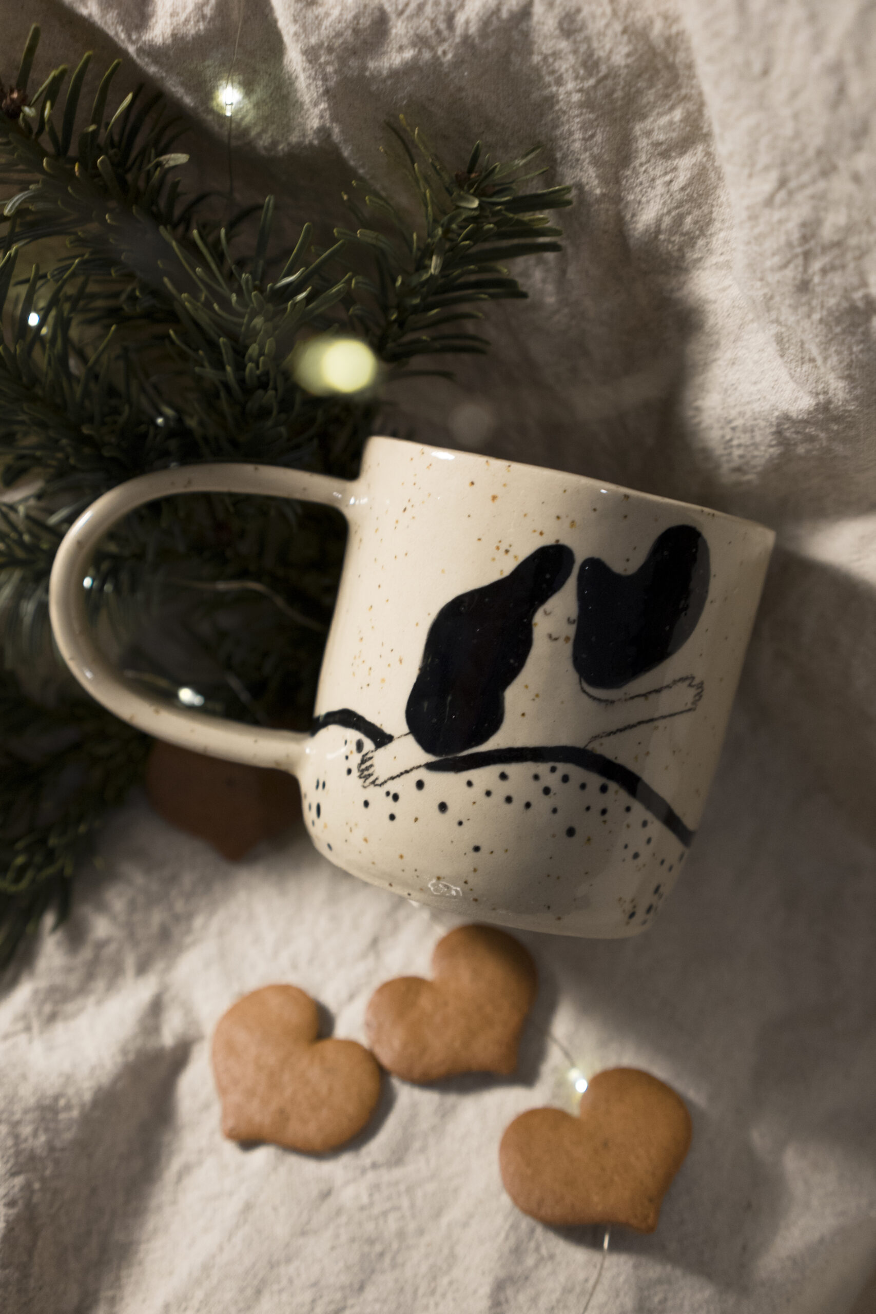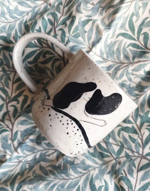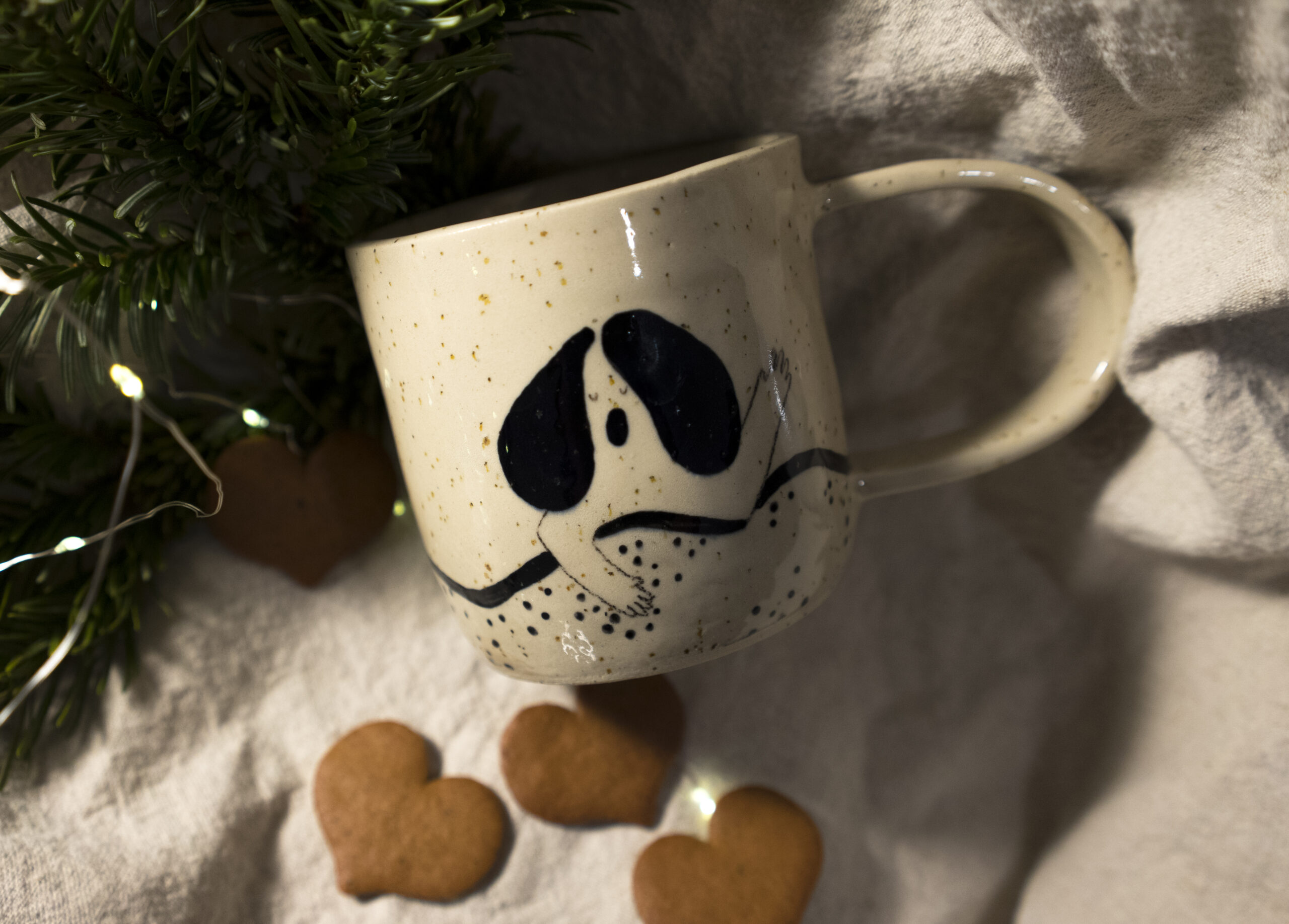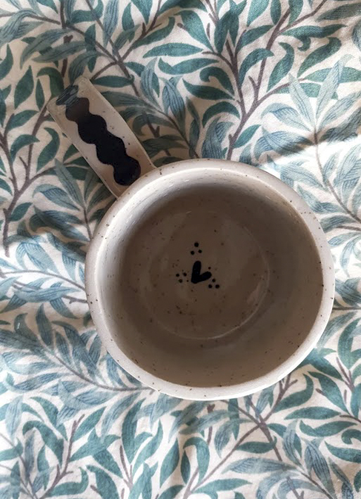 Kubek lepiony ręcznie z gliny z piegami, wygodny i pojemny kubek z unikatowymi ilustracjami. Ręczne zdobienie znajduje się także na uchu oraz wewnątrz kubka.