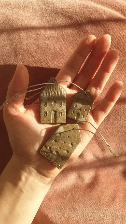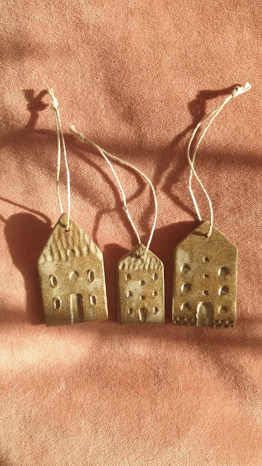 Ręcznie robione z gliny (w kolorze pieprz i sól) kamieniczki, następnie pokryte szkliwem transparentnym z perłowo – satynowymi przejściami . Nadadzą wyjątkowego charakteru zarówno świątecznemu drzewku jak i gałęzi w wazonie, która wróciła z Tobą z leśnego spaceru. Będą piękną ozdobą prezentu, możesz przewiązać pojedyncze domki wstążką i zamocować w pobliżu kokardy. Upominek będzie wyglądał niebanalnie.