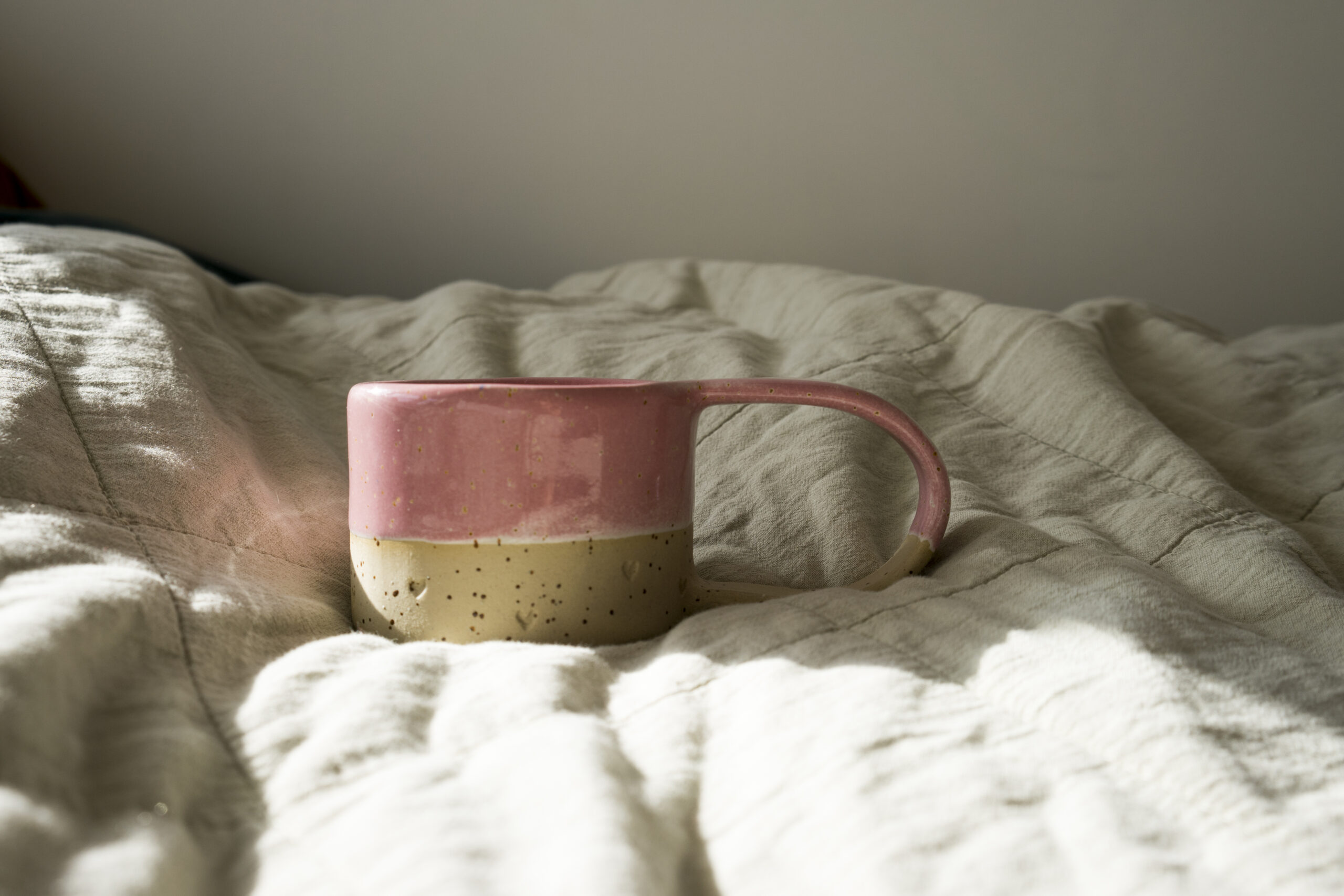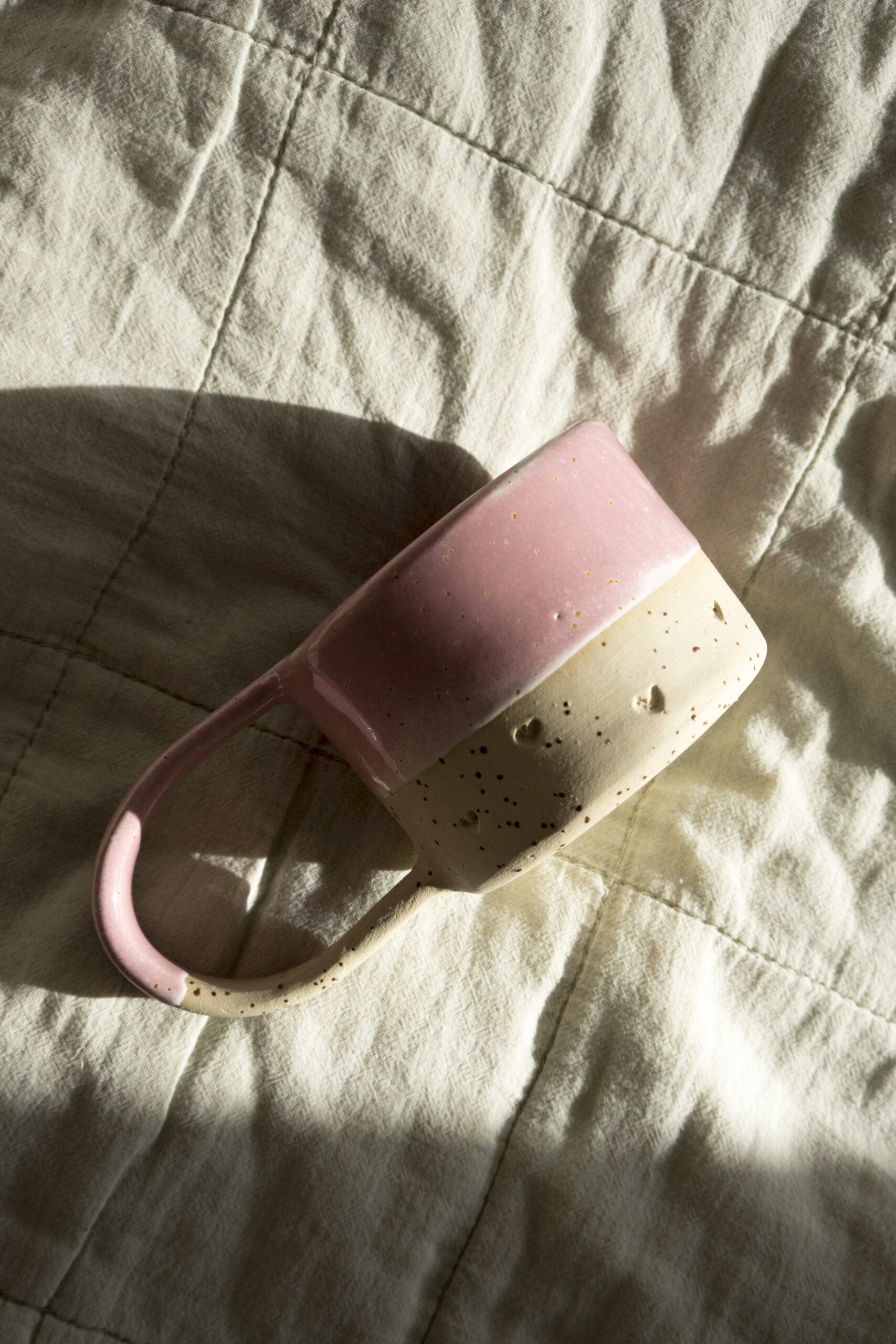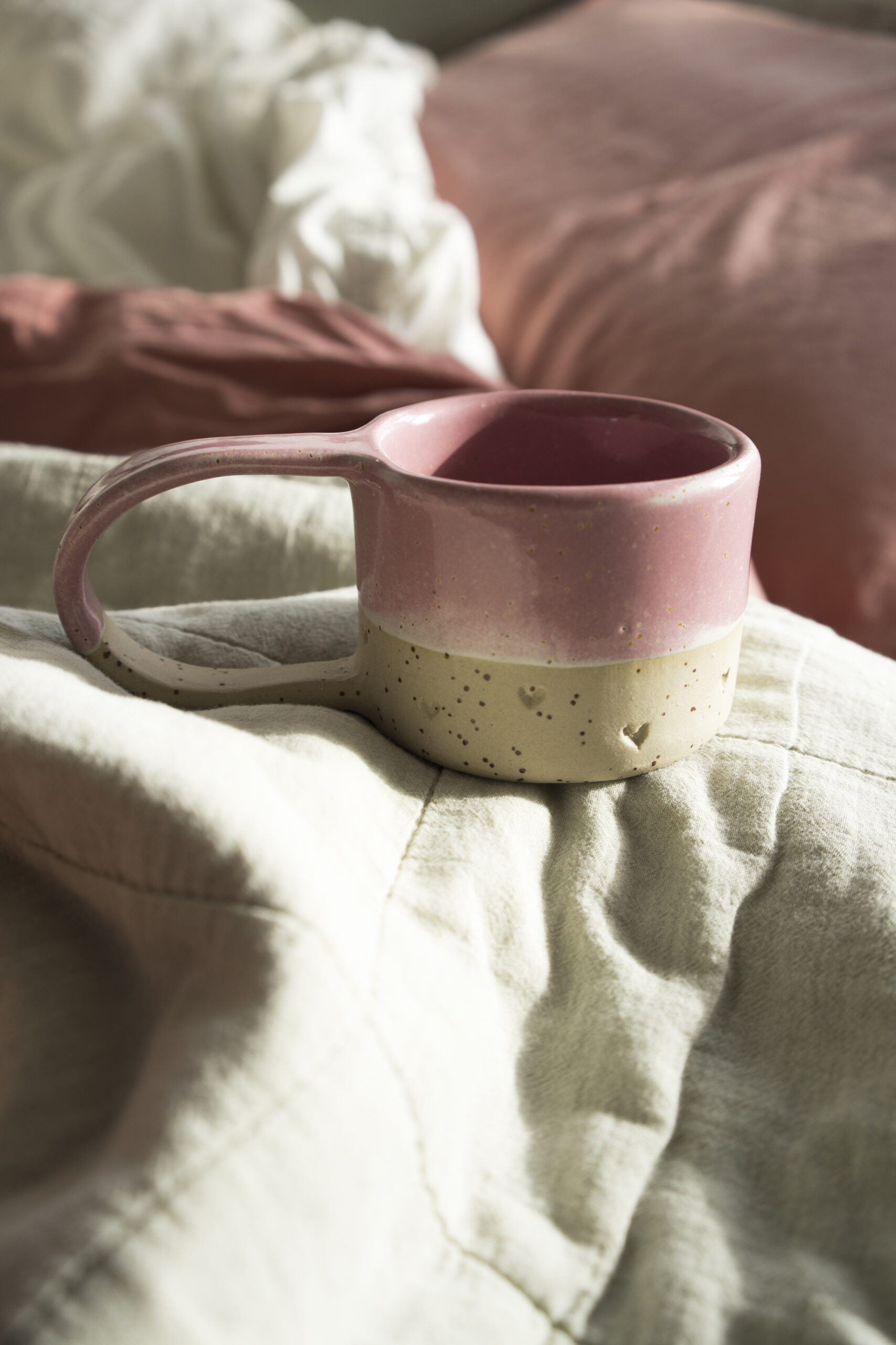Wyjątkowy, uroczy kubeczek oblany do połowy różowym błyszczącym szkliwem, poniżej pod palcami możecie poczuć surową, kropeczkową glinę i rzeźbione ręcznie, pojedynczo maleńkie serduszka. Poranna kawa, przerwa w pracy a nawet chorowanko pod kocem będzie przyjemniejsze z Twoim ulubionym kubeczkiem. Pomieści klasyczną herbatkę, czarną kawę bądź niedużą kawę z mlekiem.
