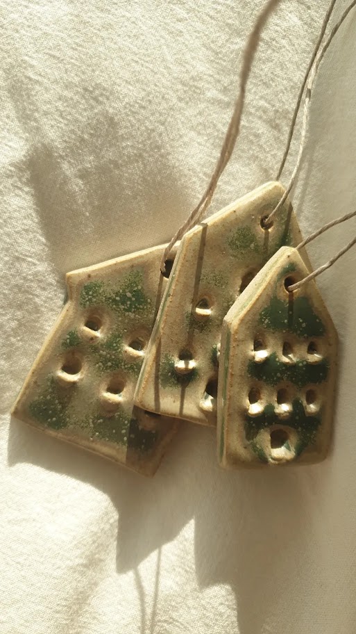 Ręcznie robione z gliny, następnie pokryte szkliwem kamieniczki w kolorze miętowym. Nadadzą wyjątkowego charakteru zarówno świątecznemu drzewku jak i gałęzi w wazonie, która wróciła z Tobą z leśnego spaceru.