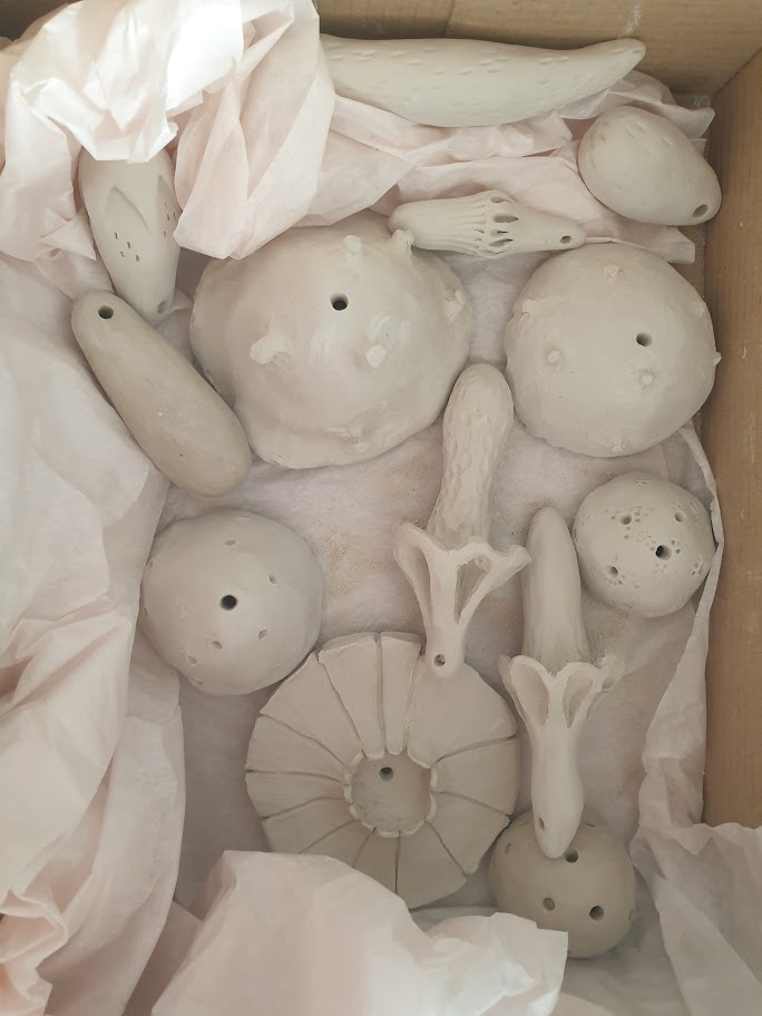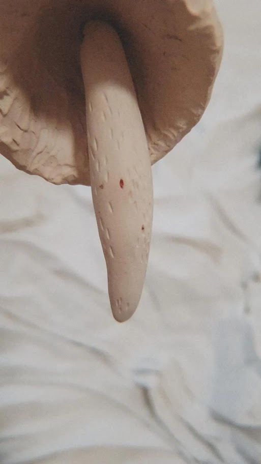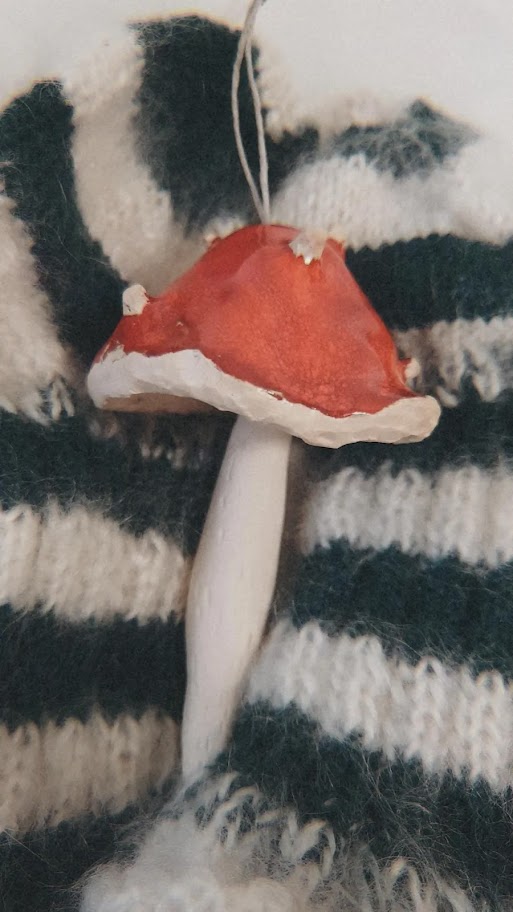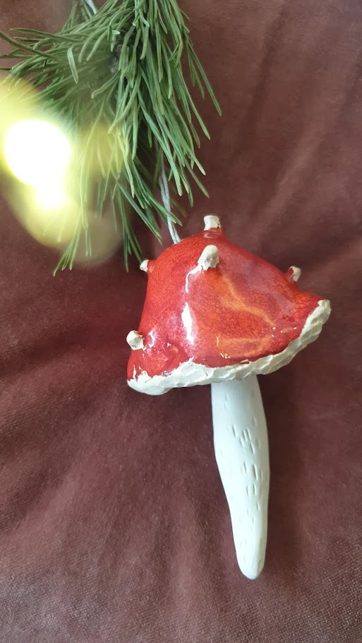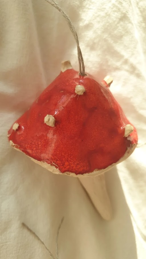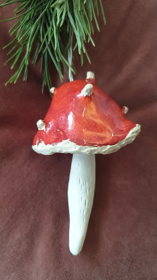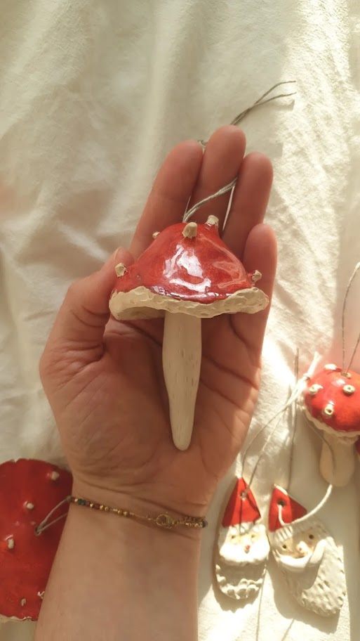 Muchomorki, robione są od początku do końca ręcznie, najpierw formowane z gliny, wypalane, szlifowane, następnie malowane i ponownie wypalane. Trzymając je w dłoni czujemy się jak w bajce. Muchomorki są unikalnymi, ręcznie tworzonymi ozdobami, nie ma dwóch takich samych. Składają się z dwóch elementów – połączonych ze sobą lnianym sznureczkiem.