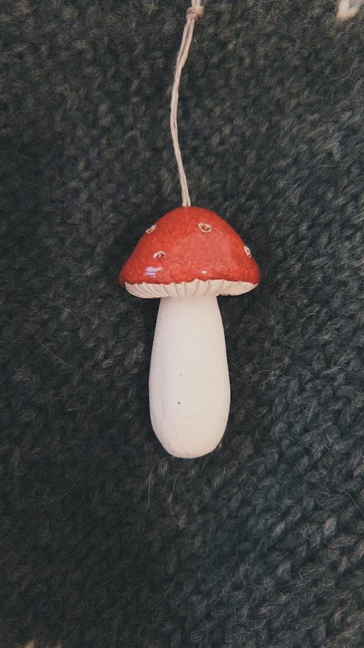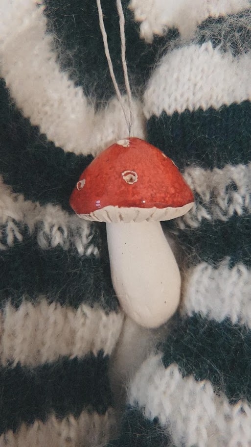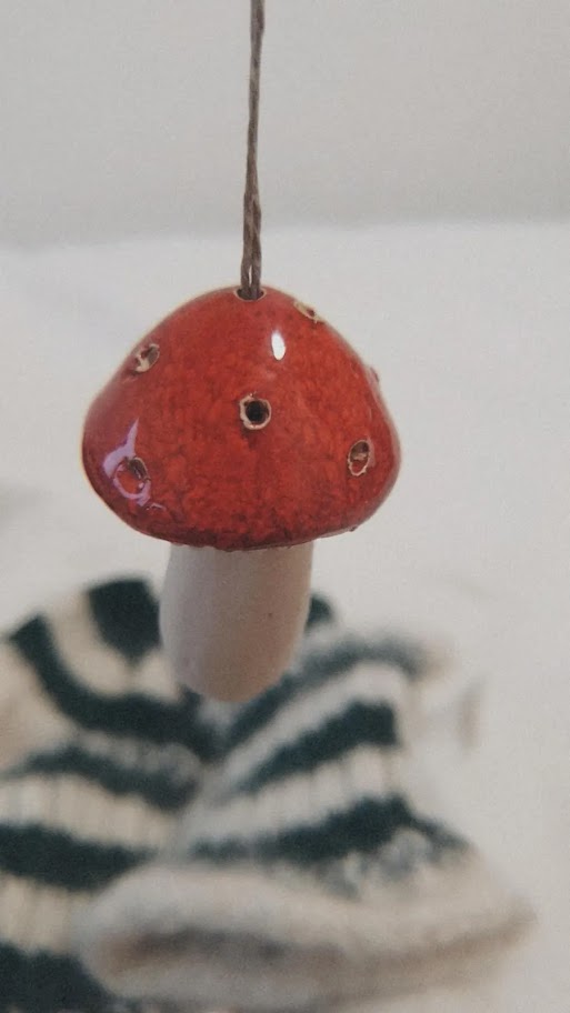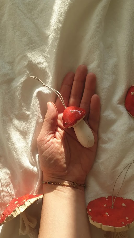 Muchomorki, robione są od początku do końca ręcznie, najpierw formowane z gliny, wypalane, szlifowane, następnie malowane i ponownie wypalane. Trzymając je w dłoni czujemy się jak w bajce. Muchomorki są unikalnymi, ręcznie tworzonymi ozdobami, nie ma dwóch takich samych. Składają się z dwóch elementów – połączonych ze sobą lnianym sznureczkiem.