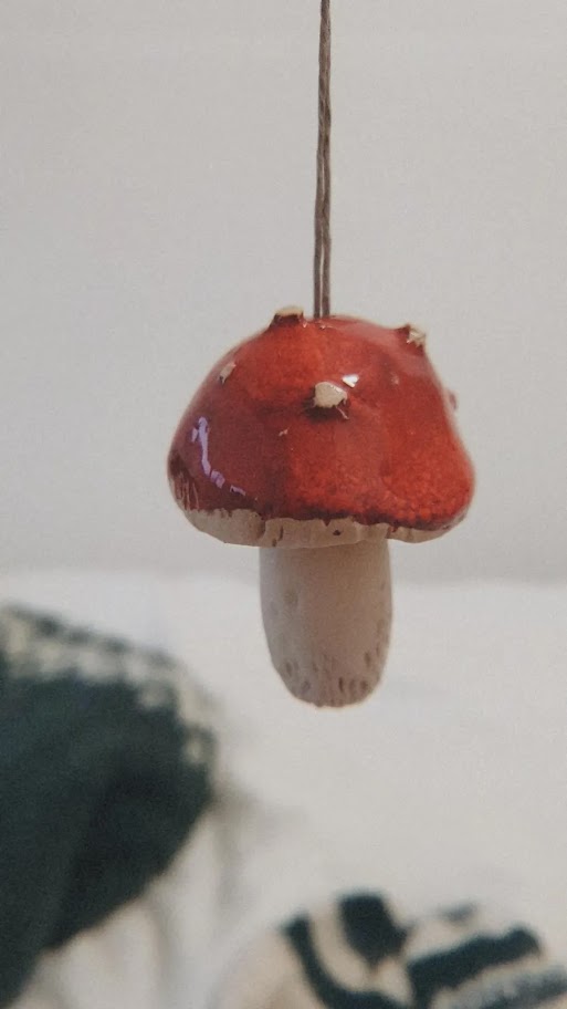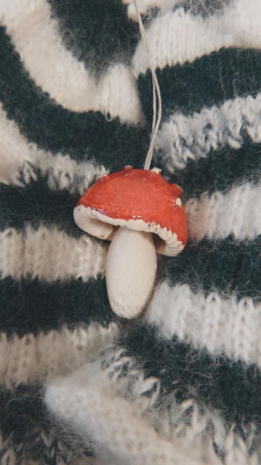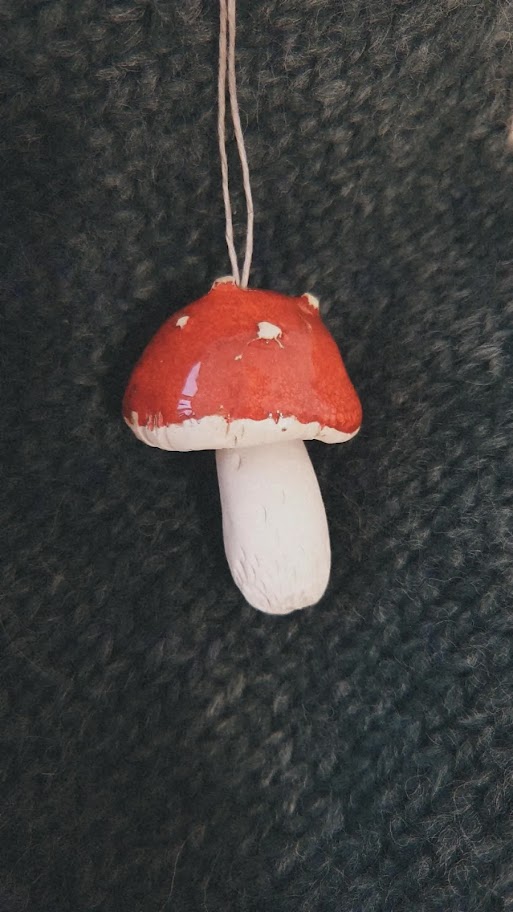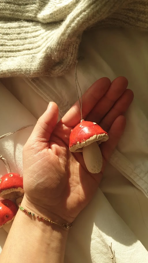 Muchomorki, robione są od początku do końca ręcznie, najpierw formowane z gliny, wypalane, szlifowane, następnie malowane i ponownie wypalane. Trzymając je w dłoni czujemy się jak w bajce. Muchomorki są unikalnymi, ręcznie tworzonymi ozdobami, nie ma dwóch takich samych. Składają się z dwóch elementów – połączonych ze sobą lnianym sznureczkiem.
