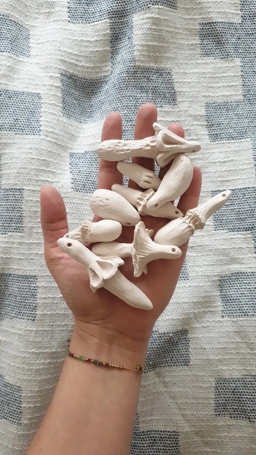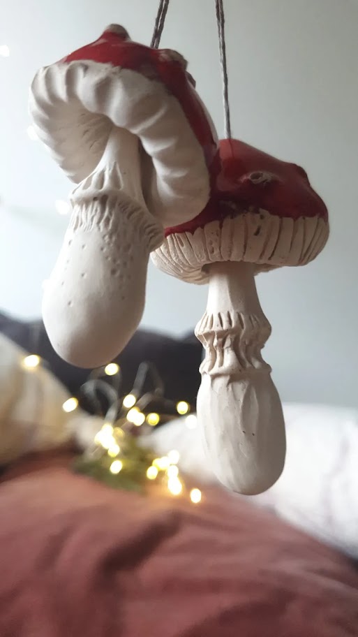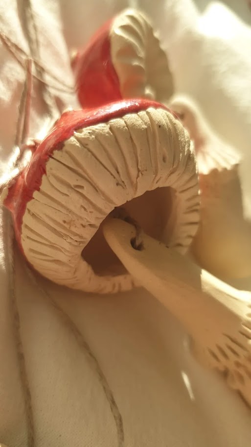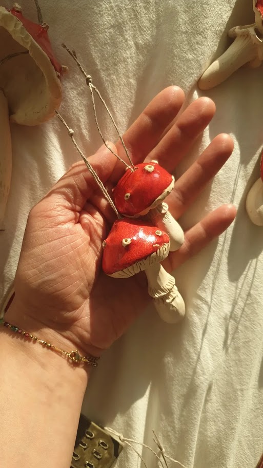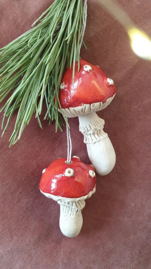 Muchomorki, robione są od początku do końca ręcznie, najpierw formowane z gliny, wypalane, szlifowane, następnie malowane i ponownie wypalane. Trzymając je w dłoni czujemy się jak w bajce. Muchomorki są unikalnymi, ręcznie tworzonymi ozdobami, nie ma dwóch takich samych. Składają się z dwóch elementów – połączonych ze sobą lnianym sznureczkiem.