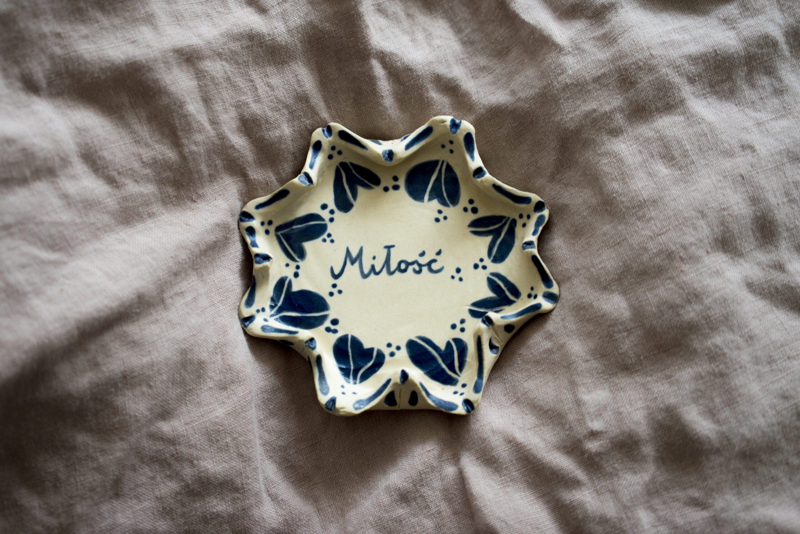 Formowany ręcznie z gliny. Malowany ręcznie granatową farbką podszkliwną z wykorzystaniem techniki sgraffito, następnie poszkliwiony transparentnym szkliwem satynowym. Wygląda jak gotowy obrazek w ramce. Ten motyw i stylistyka spodobał się Wam tak bardzo, że powstały nawet kartki w podobnym klimacie, z tym samym napisem. Jeszcze więcej miłości!