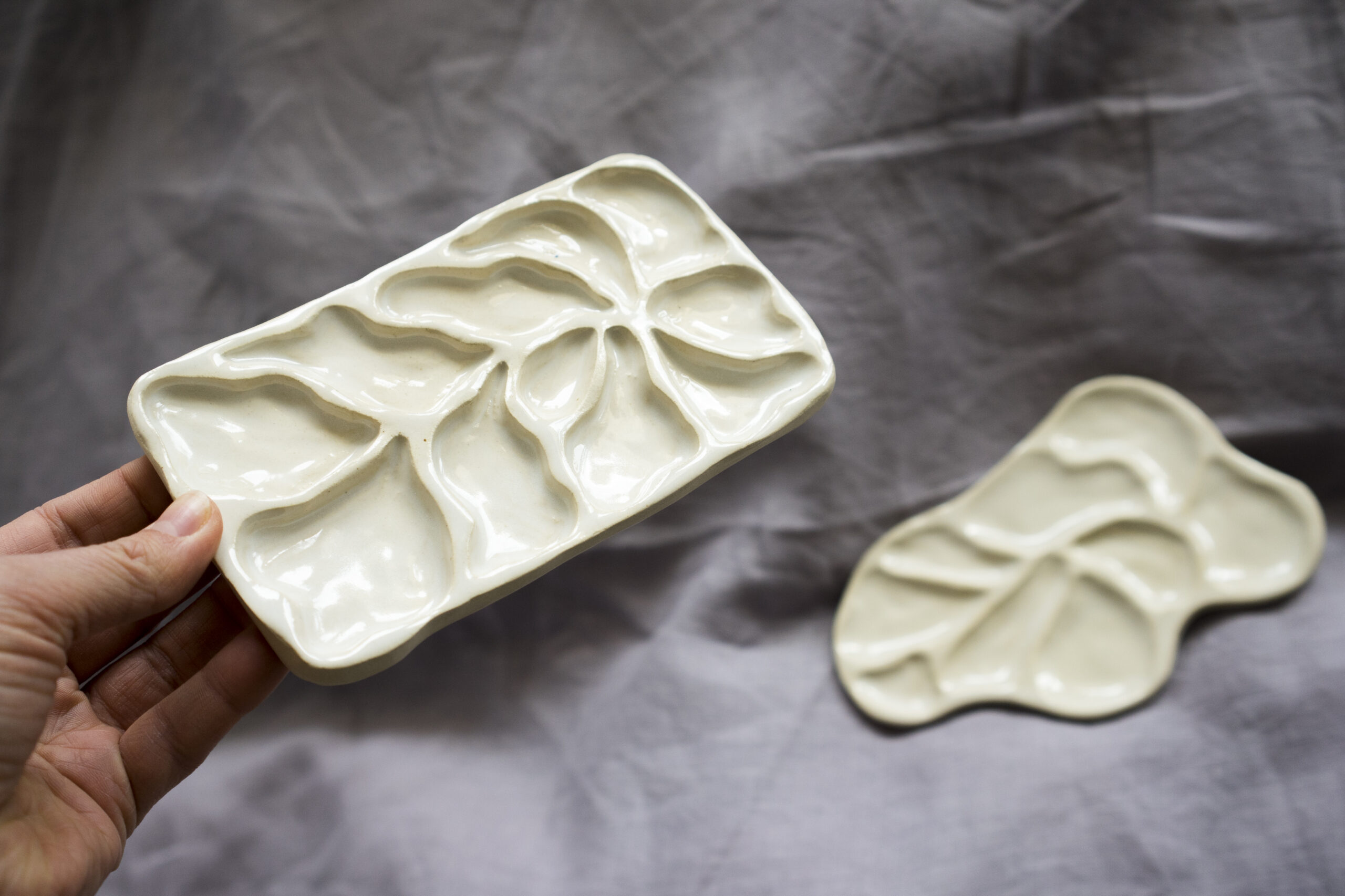 Paletka lepiona ręcznie z jasnej, gładkiej gliny, pokryta błyszczącym szkliwem.