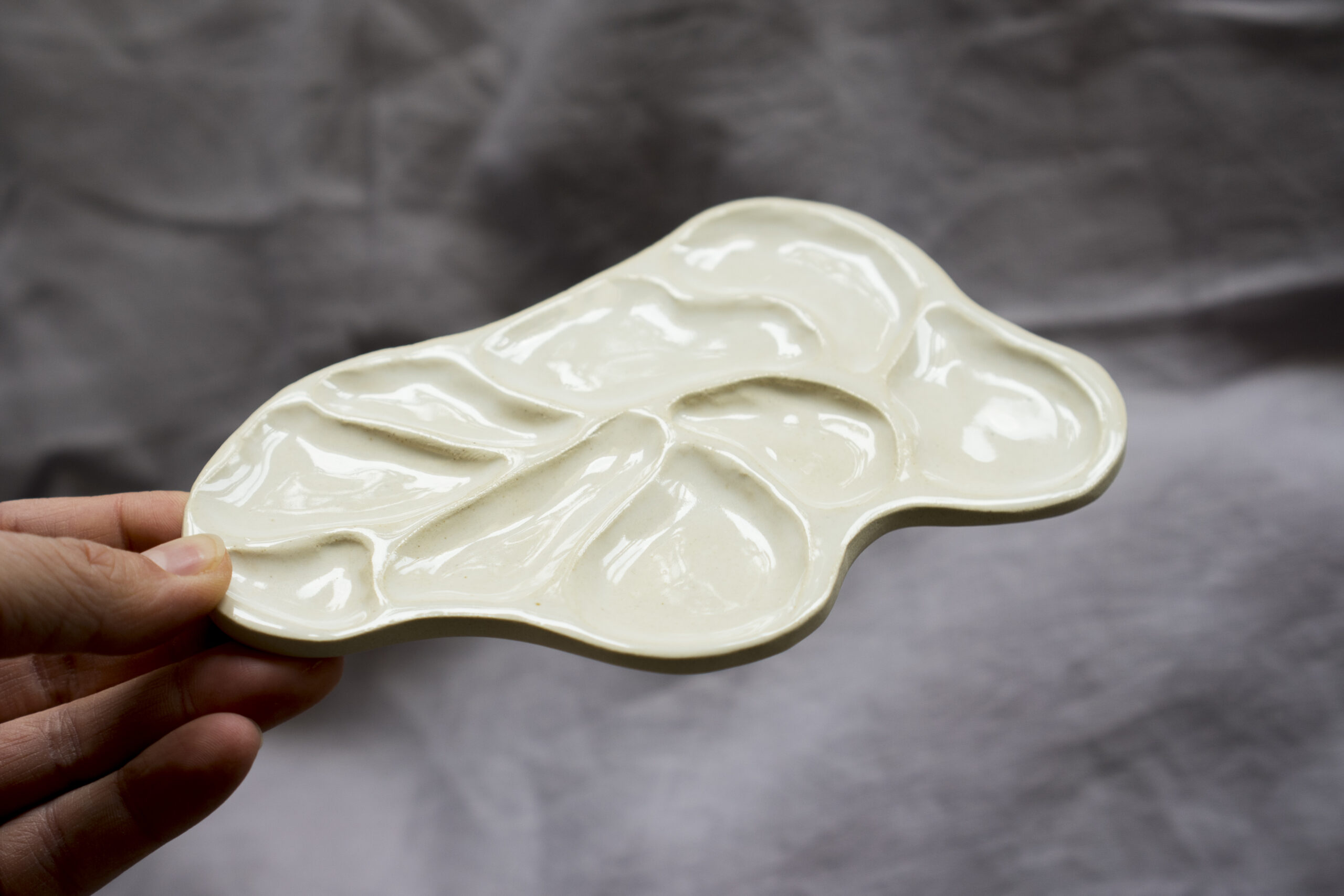 Paletka lepiona ręcznie z jasnej, gładkiej gliny, pokryta błyszczącym szkliwem.