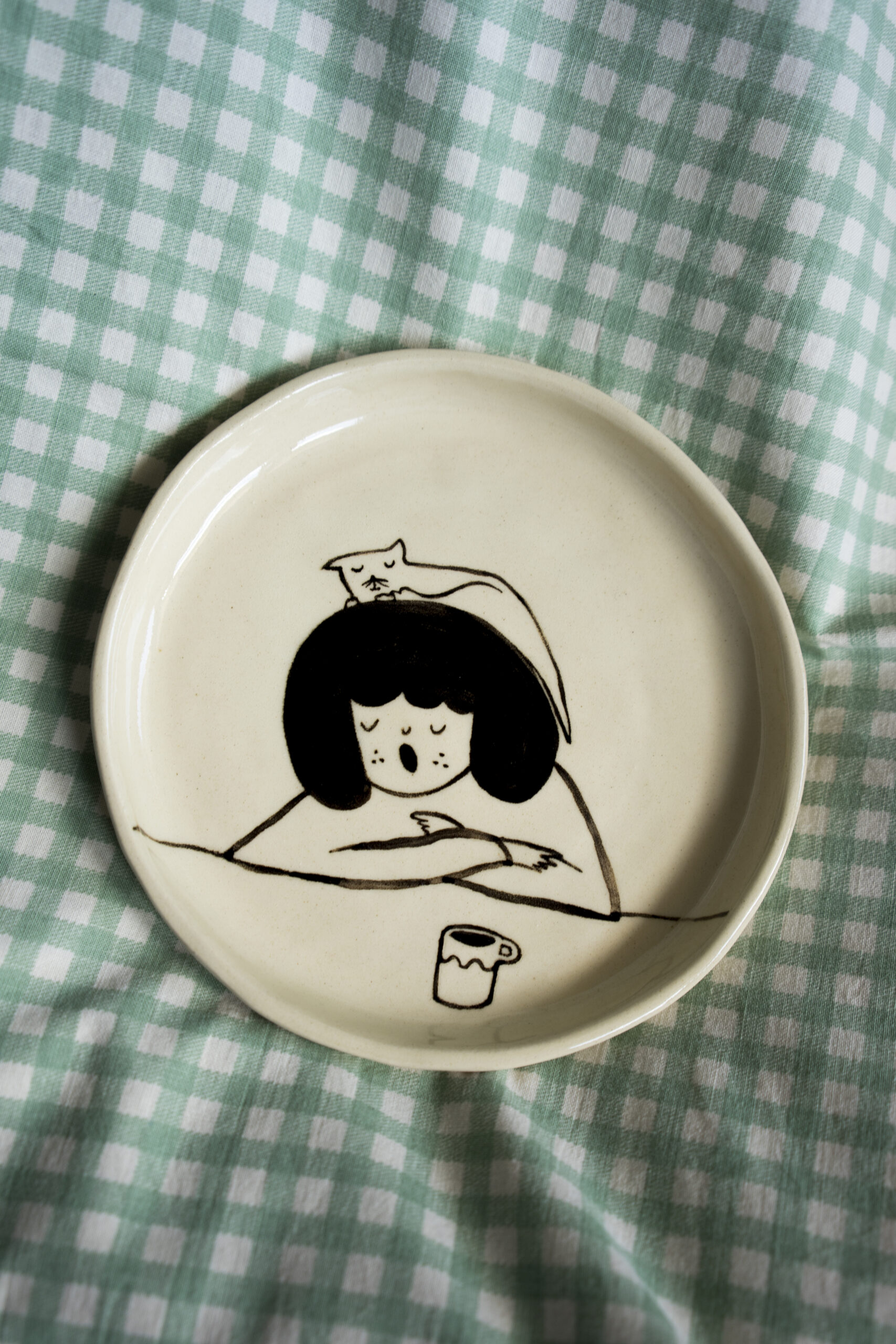 Przedstawiam Ci talerz formowany ręcznie z gliny, następnie wypalony, wyszlifowany z dbałością o szczegóły. Zdobi go autorska ilustracja z dziewczyną ze śpiącym kotem wykonana przy użyciu wysokiej jakości farb podszkliwnych. Cała wierzchnia strona talerza pokryta jest bezbarwnym szkliwem błyszczącym. Naczynie to będzie wyjątkową dekoracją w Twoim wnętrzu.